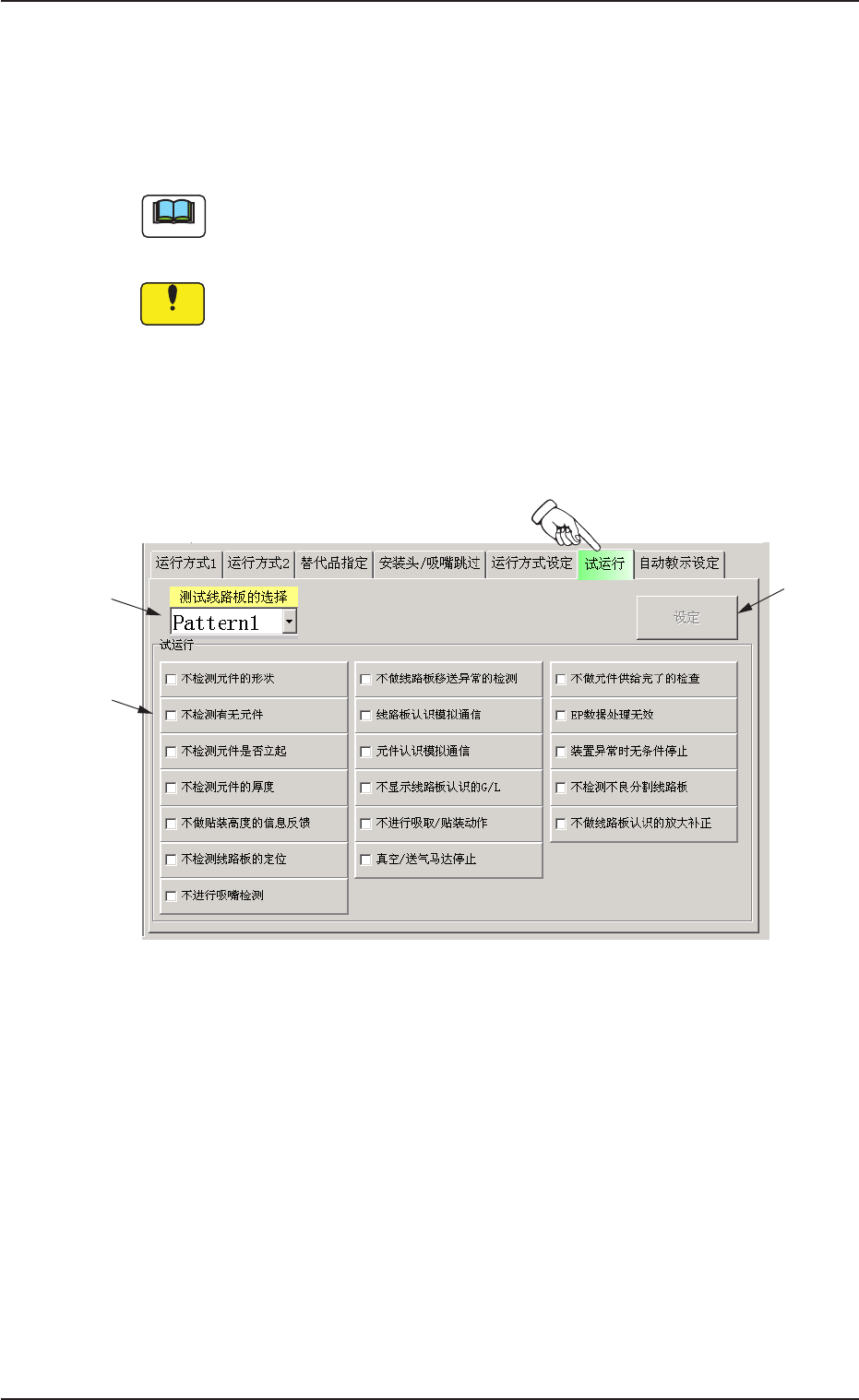 3.5 3.5 3.5 3.5 3.5 “ 试运行 试运行 试运行 试运行 试运行 ” Tab Tab Tab Tab Tab 就试运行的方式进行设定。 设定装置的维护以及点检为目的的试运行环境。 所谓试运行,是特意设定有无异常检测或认识的通信方法 等环境的运行方式。 请不要进行试运行下的生产。 请不要进行试运行下的生产。 请不要进行试运行下的生产。 请不要进行试运行下的生产。 请不要进行试运行下的生产。 • 会导致装置的故障以及破损。…