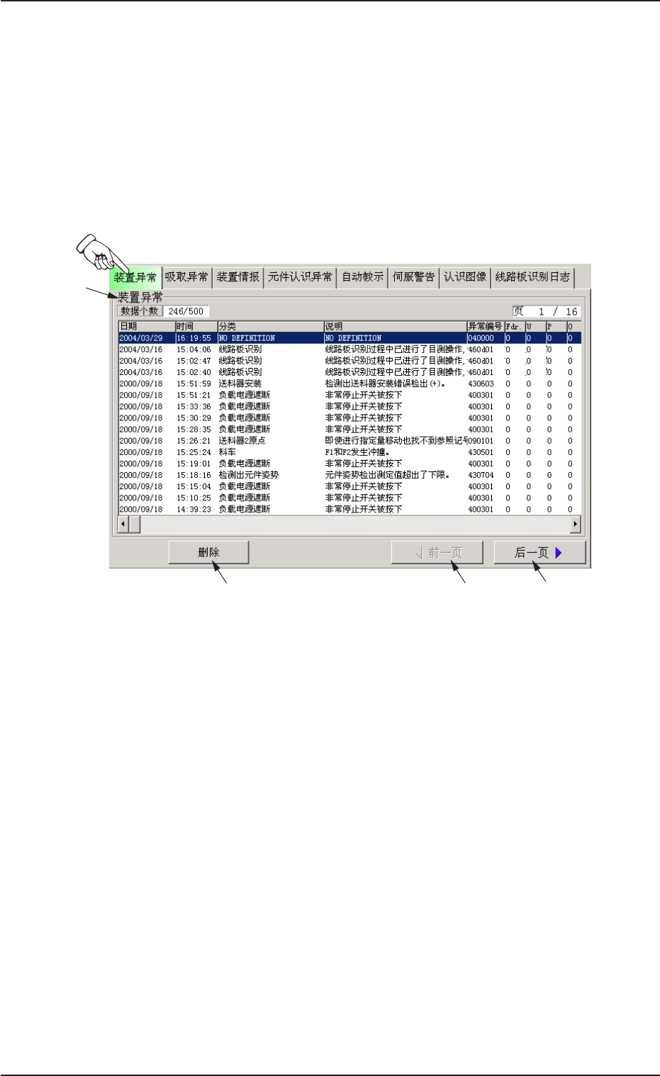 吸取异常 显示发生吸取异常的送料器编号、日期和时间、异常编号、异