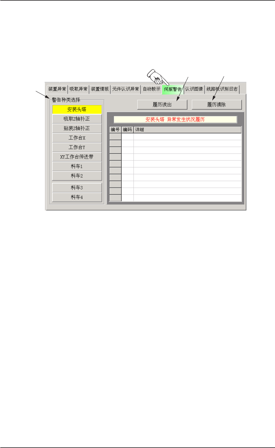 在 “ 情报再显示 ” 子菜单界面中,按[ 伺服警告]Tab,便显示以下
