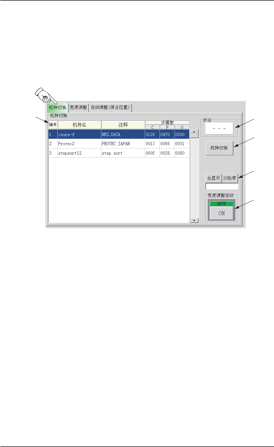7. 1 7. 1 7. 1 7. 1 7. 1 “ 机种切换 机种切换 机种切换 机种切换 机种切换 ” Tab Tab Tab Tab Tab 切换进行生产运行的机种 ( 线路板程序 ) 。 • 页面显示 页面显示 页面显示 页面显示 页面显示 在 “ 机种切换 ” 子菜单界面中,按 [ 机种切换 ]Tab ,便显示以下选 项卡。 Fig.2E60 Fig.2E60 Fig.2E60 Fig.2E60 Fig.2E60 “ 机种切换…