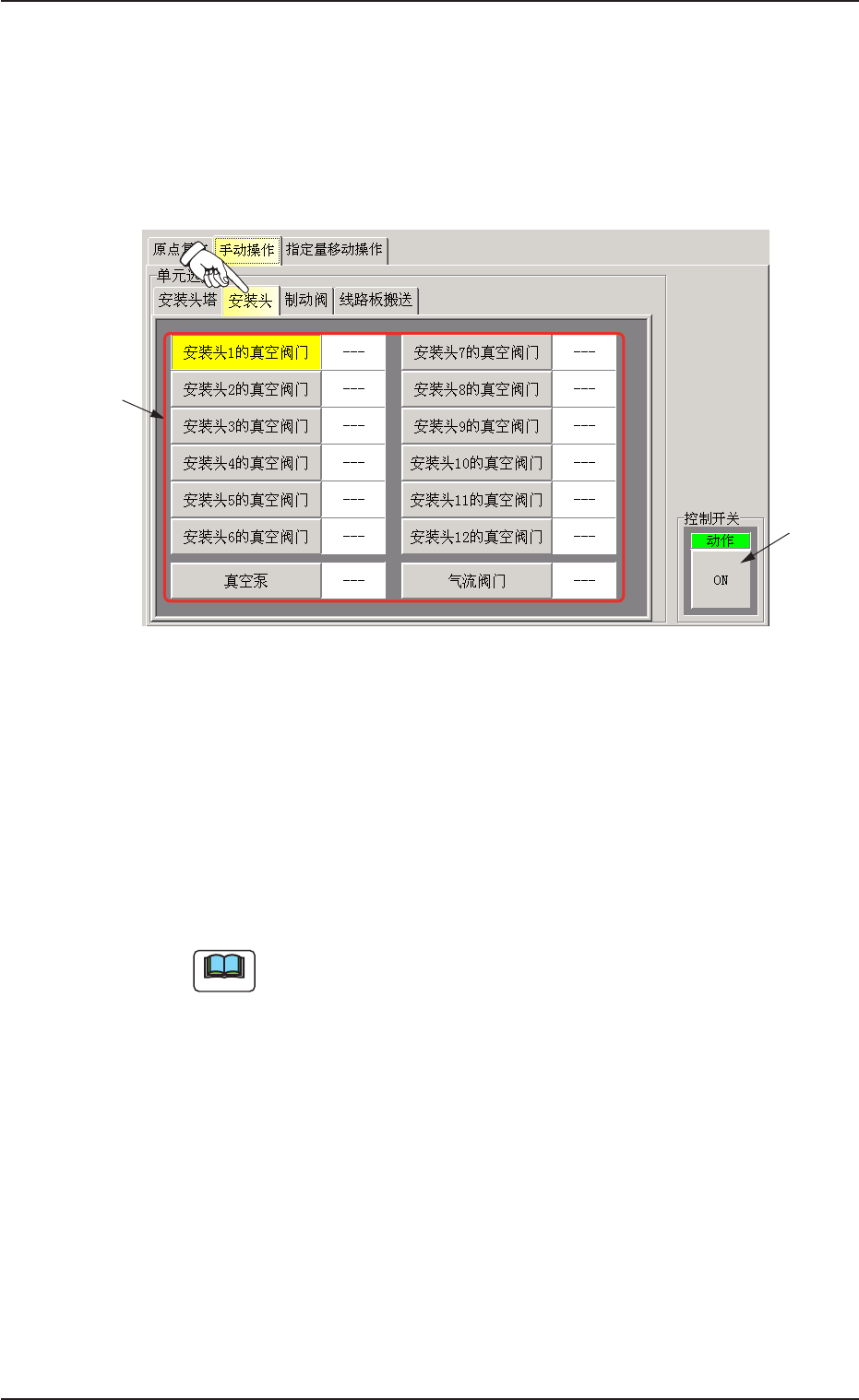 按该按钮,使其呈黄色,该安装头的阀门被选定。再按一次,