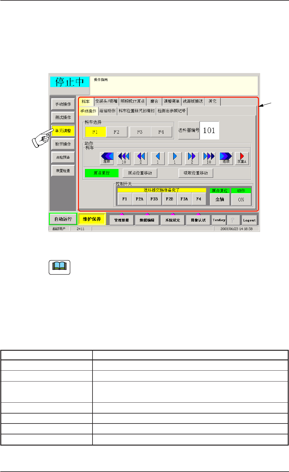 在 “ 料车 ” 选项卡中,按[ 手动操作]Tab,便显示以下选项卡。