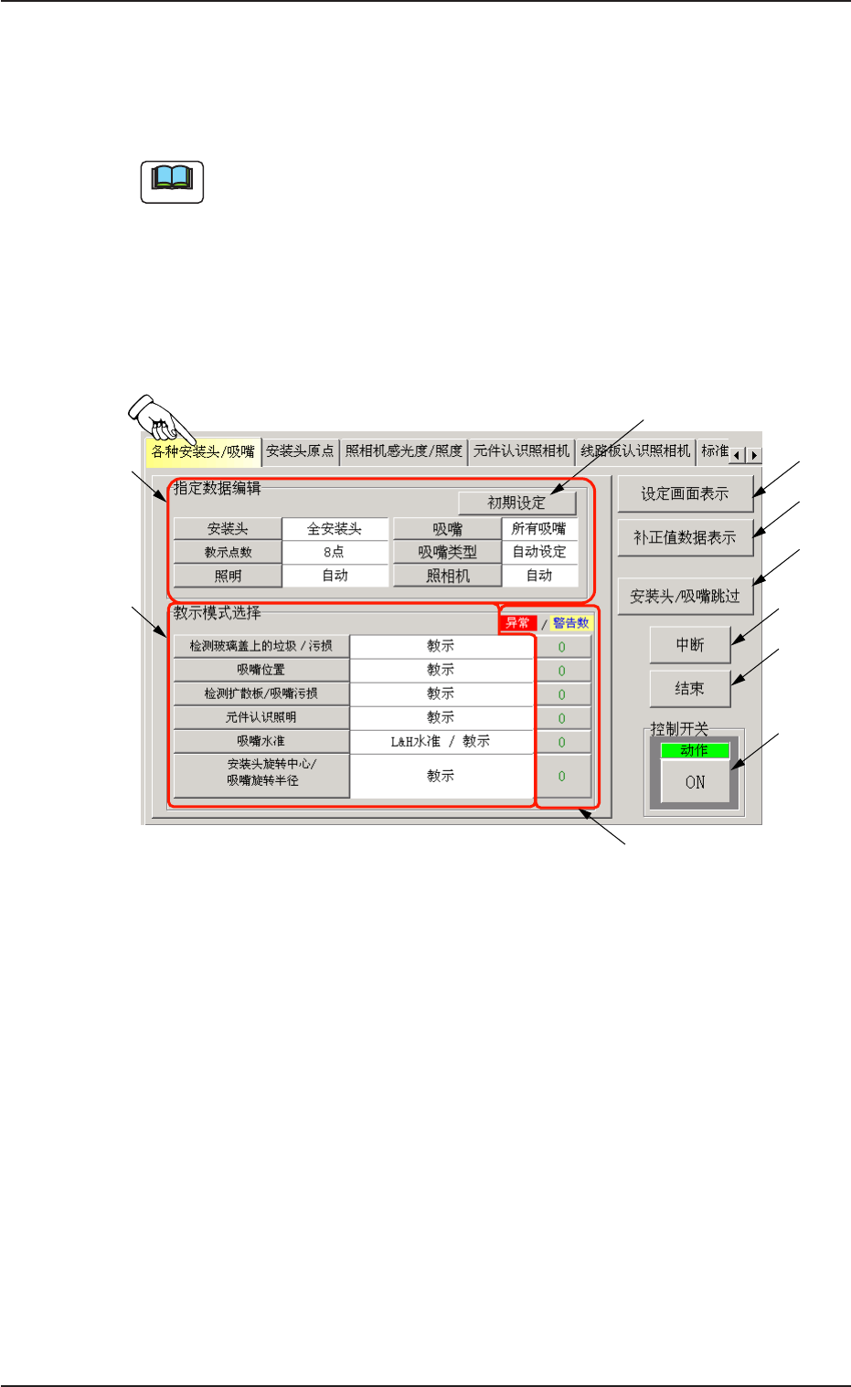 5. 1 5. 1 5. 1 5. 1 5. 1 “ 各种安装头 各种安装头 各种安装头 各种安装头 各种安装头 / / / / / 吸嘴 吸嘴 吸嘴 吸嘴 吸嘴 ” Tab Tab Tab Tab Tab 执行各种安装头和吸嘴的教示。 (a) 拆卸 / 安装吸嘴或安装头时,请务必执行该教示。 (b) 装置在 “ 待机中 ” 或 “ 教示中 ” 状态下,不能向 “ (4) 补 正值数据的确认 ” 以外移行。 • 页面显示 页面显示 页面…