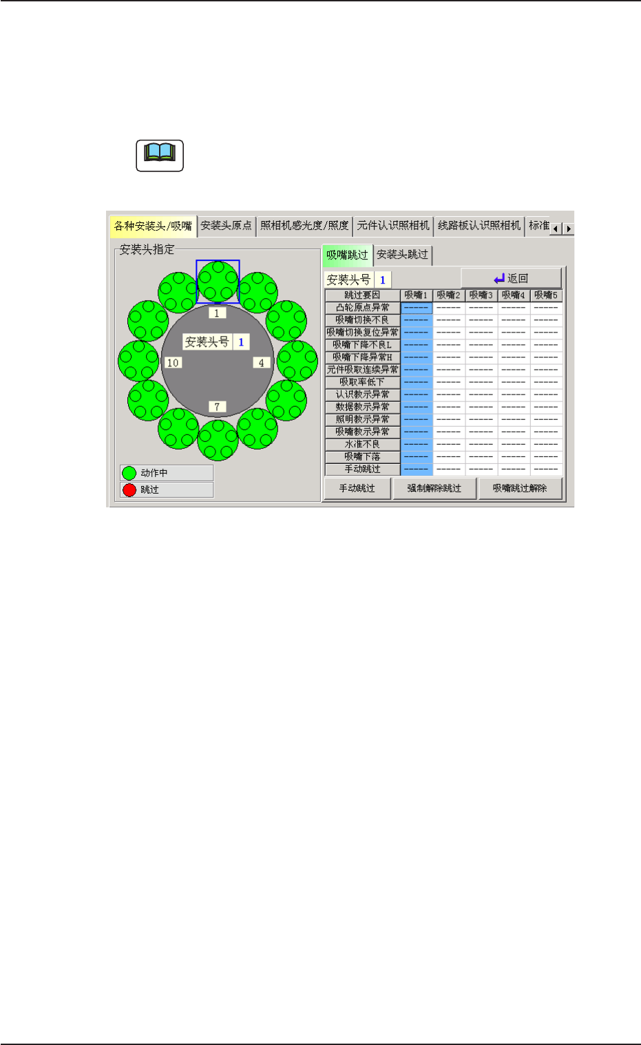 (6) 安装头 / 吸嘴跳过的确认和设定 按 * 1 0 * 1 0 * 1 0 * 1 0 * 1 0[ 安装头 / 吸嘴跳过 ] 按钮,便显示 “ 安装头 / 吸嘴跳过 ” 界面。 选择安装头指定的图像,显示各吸嘴跳过的情况。 各吸嘴跳过要因的详细内容请参照 “ 第五节 3.3 “ 安 装头 / 吸嘴跳过 ” Tab ” 章节。 Fig.2F82 Fig.2F82 Fig.2F82 Fig.2F82 Fig.2F82 “ 吸嘴跳过 …