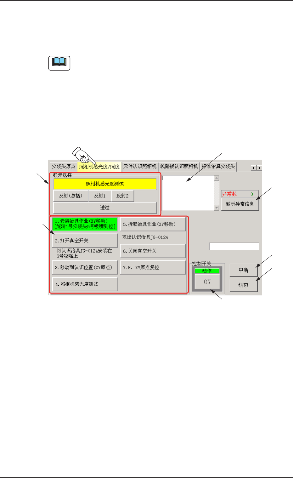 0409-002 6 - 108 [ [ [ [ [ 透过 透过 透过 透过 透过 ] ] ] ] ] 按钮 按钮 按钮 按钮 按钮 执行照相机照度教示时选择。 测试照相机的感光度时,按 [ 照相机感光度测试 ] 按钮,使其呈 黄色, *2 *2 *2 *2 *2 中显示出照相机感光度测试的教示步骤。 *2 *2 *2 *2 *2 教示选择按钮 教示选择按钮 教示选择按钮 教示选择按钮 教示选择按钮 显示 * 1 * 1 * 1 * 1…