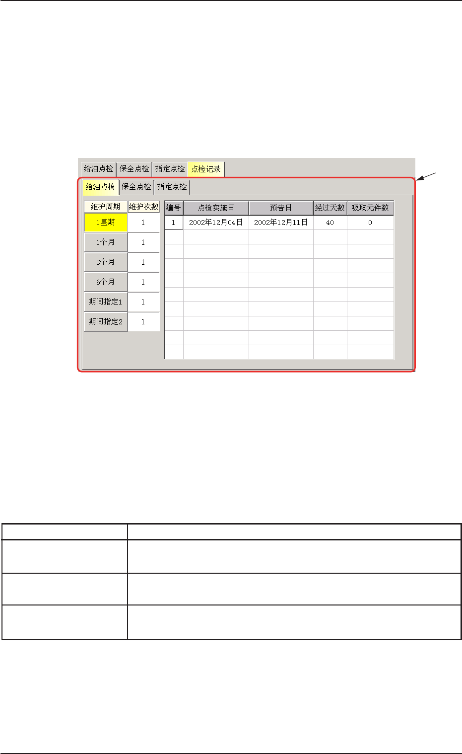 6.4 6.4 6.4 6.4 6.4 “ 点检记录 点检记录 点检记录 点检记录 点检记录 ” Tab Tab Tab Tab Tab 点检预告的 “ 给油点检 ” 、 “ 保全点检 ” 、 “ 指定点检 ” 中,将点检预 告设定为 “ 预告 ” ,并可显示满足预告条件项的保修经历。 • 页面显示 页面显示 页面显示 页面显示 页面显示 在 “ 点检预告 ” 子菜单界面中,按 [ 点检记录 ]Tab ,便显示以下选 项卡。 Fig.2…