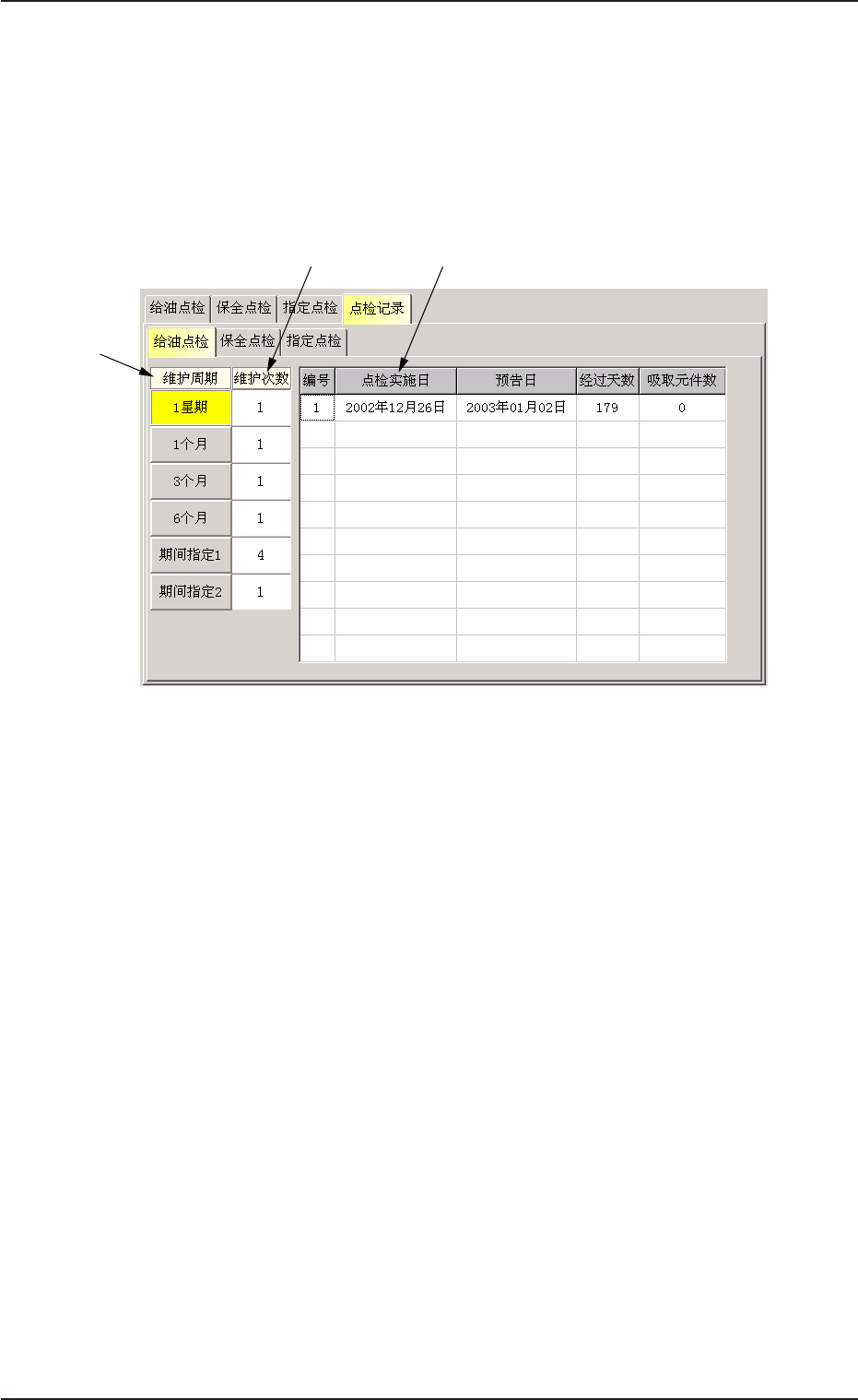在 “ 点检记录 ” 子菜单界面中,按[ 给油点检]Tab,便显示以下选