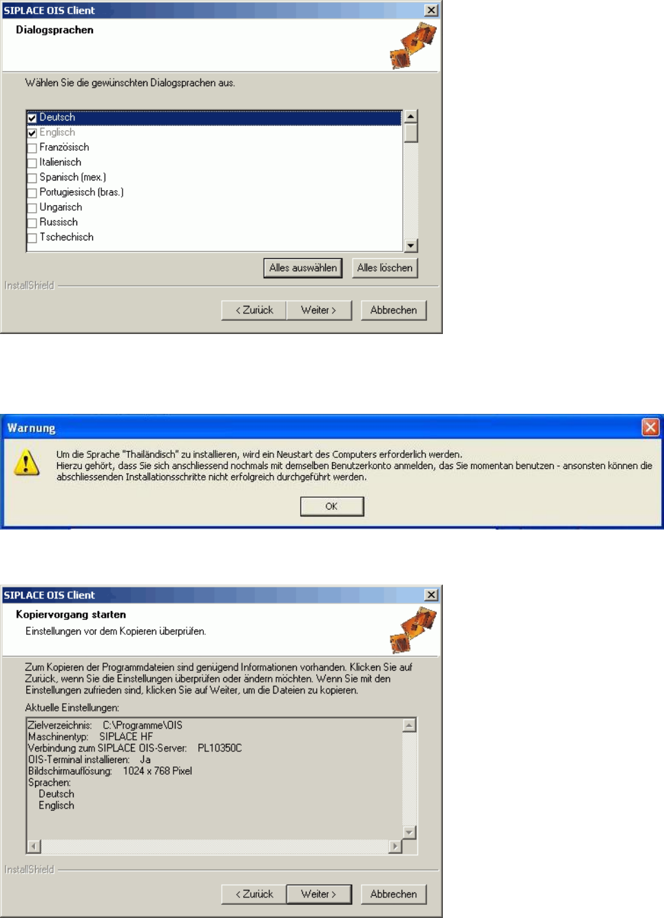 OIS Client, OIS Server, SIS Server Version 5.2 Installationsanleitung Installation manual ¾ Klicken Sie auf die Schaltfläche Weiter > . ¾ Wählen Sie die gewünschten Spra chen aus. Die Sprachen Deutsch und Englisch wer…