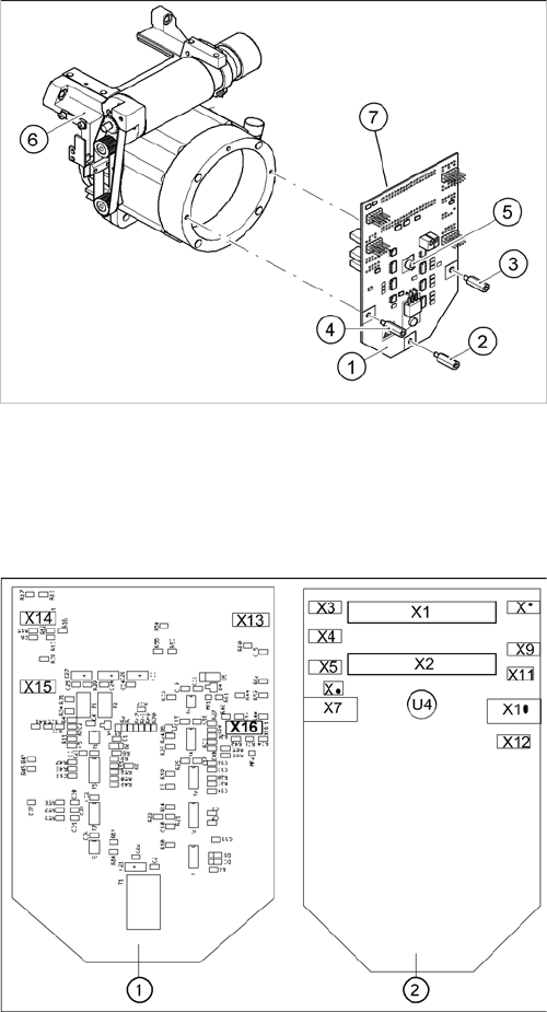 从中部分配器上的插头 X1 与 X2 引出的两根 40 针的扁平带状电缆连接贴片头板上的插槽 X14 / X13。