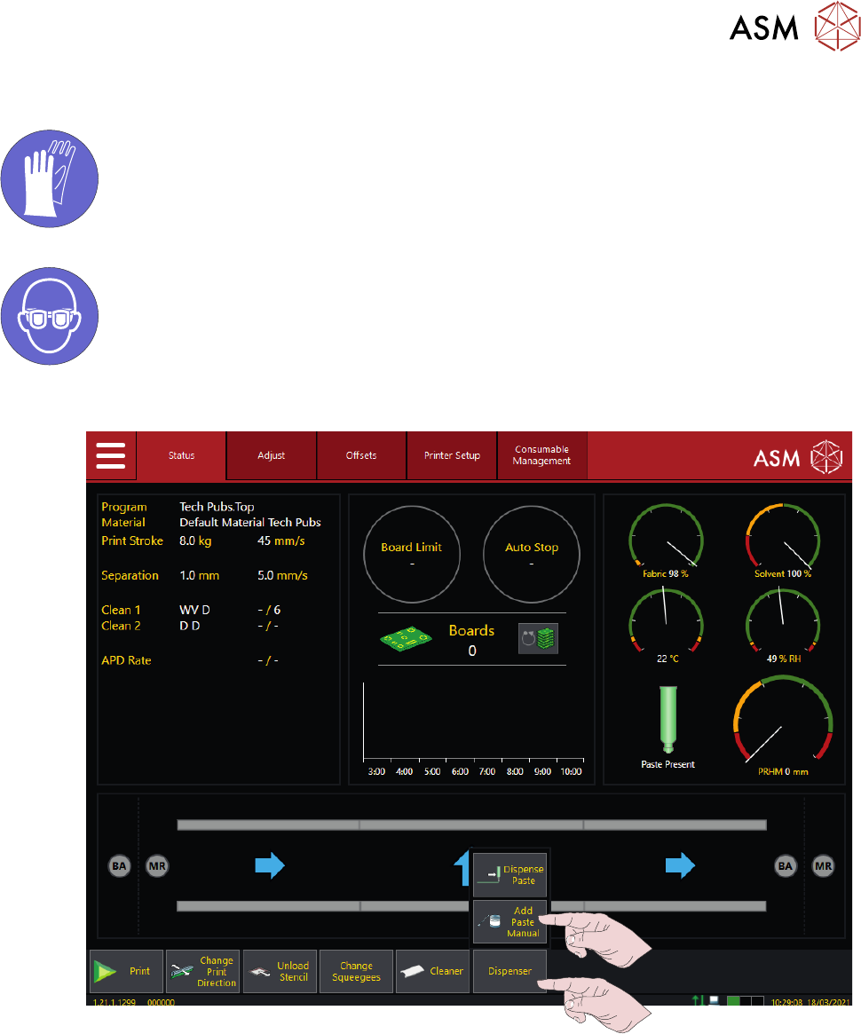 8 补充 8.5 添加锡膏手动更换丝网 操作手册 DEK TQ 04/2021 125 8.5 添加锡膏手动更换丝网 强制性 有毒物质可能存在。 安全手套必须坚固。 强制性 。需戴防护眼镜。 有毒物质可能存在 1. 1 2