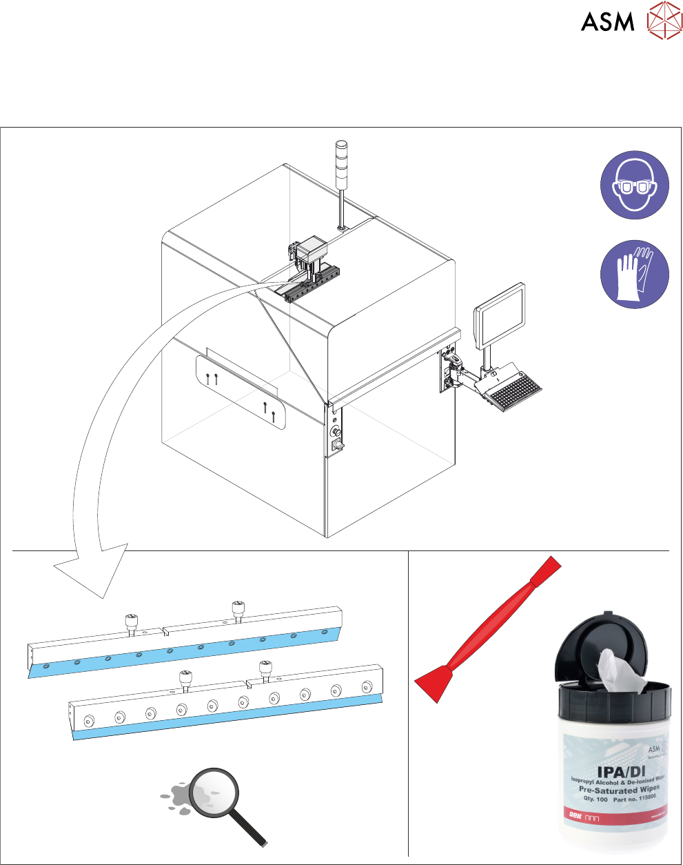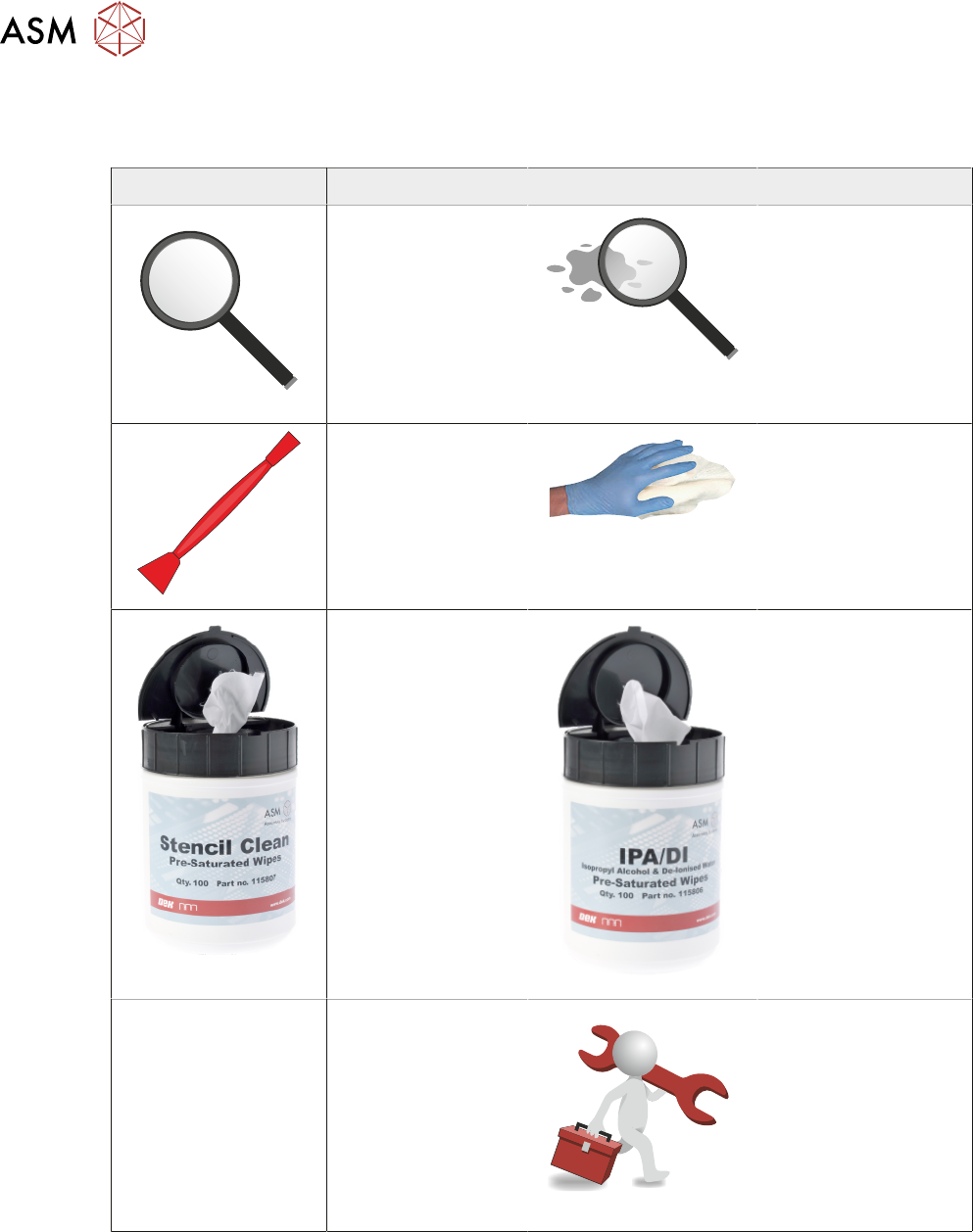 9 保养 9.2 钥匙 178 操作手册 DEK TQ 04/2021 9.2 钥匙 下表中显示了本章中使用的符号及其定义: 符号 定义 符号 定义 目视检查项目 检查物品是否 被污染 用塑料刮刀清洁 用干布清洁受污染的区 域,不要使用化学药品 模板清洁 IPA 湿巾 向 工程师上报