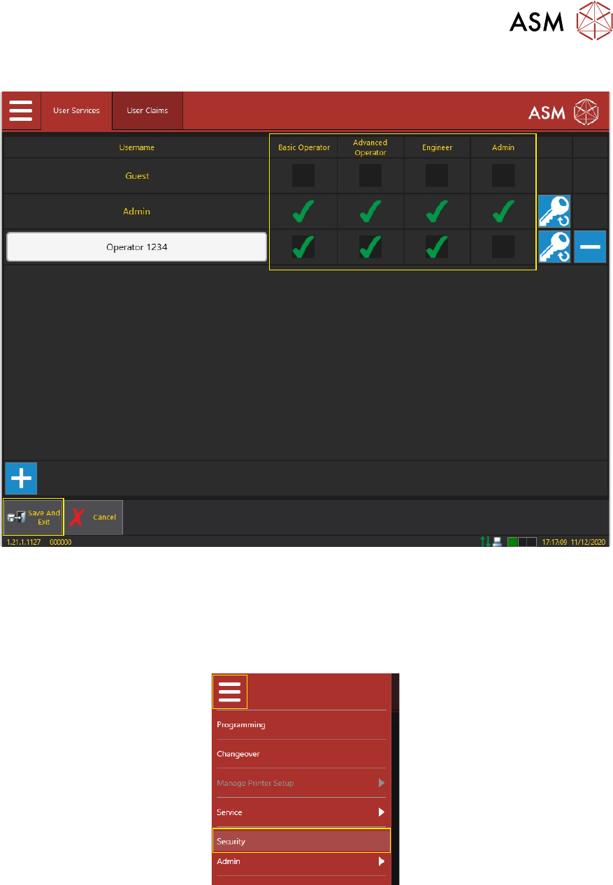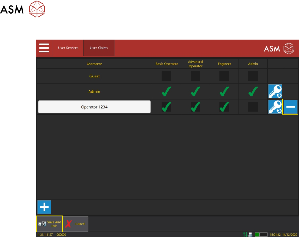 10 高级操作 10.1 用户管理 206 操作手册 DEK TQ 04/2021 2. 选择要删除的用户行末尾的 minus 号按钮。 3. 选择 Save and Exit .
