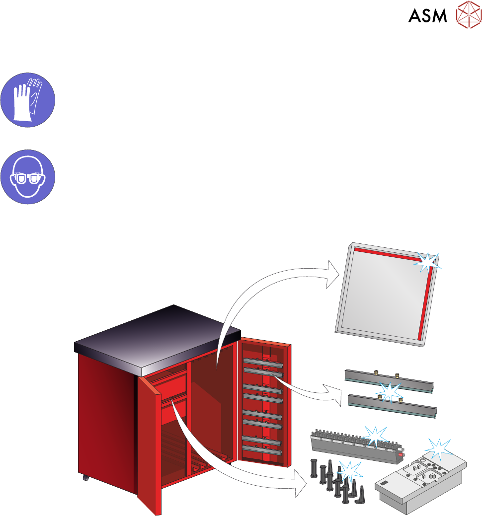 3 概述 3.3 机器准备 操作手册 DEK TQ 04/2021 29 3.3.2 工具及丝网准备 强制性 有毒物质可能存在。 安全手套必须坚固。 强制性 。需戴防护眼镜。 有毒物质可能存在 1. 确保要在打印机上使用的所有物品都是干净无损的。
