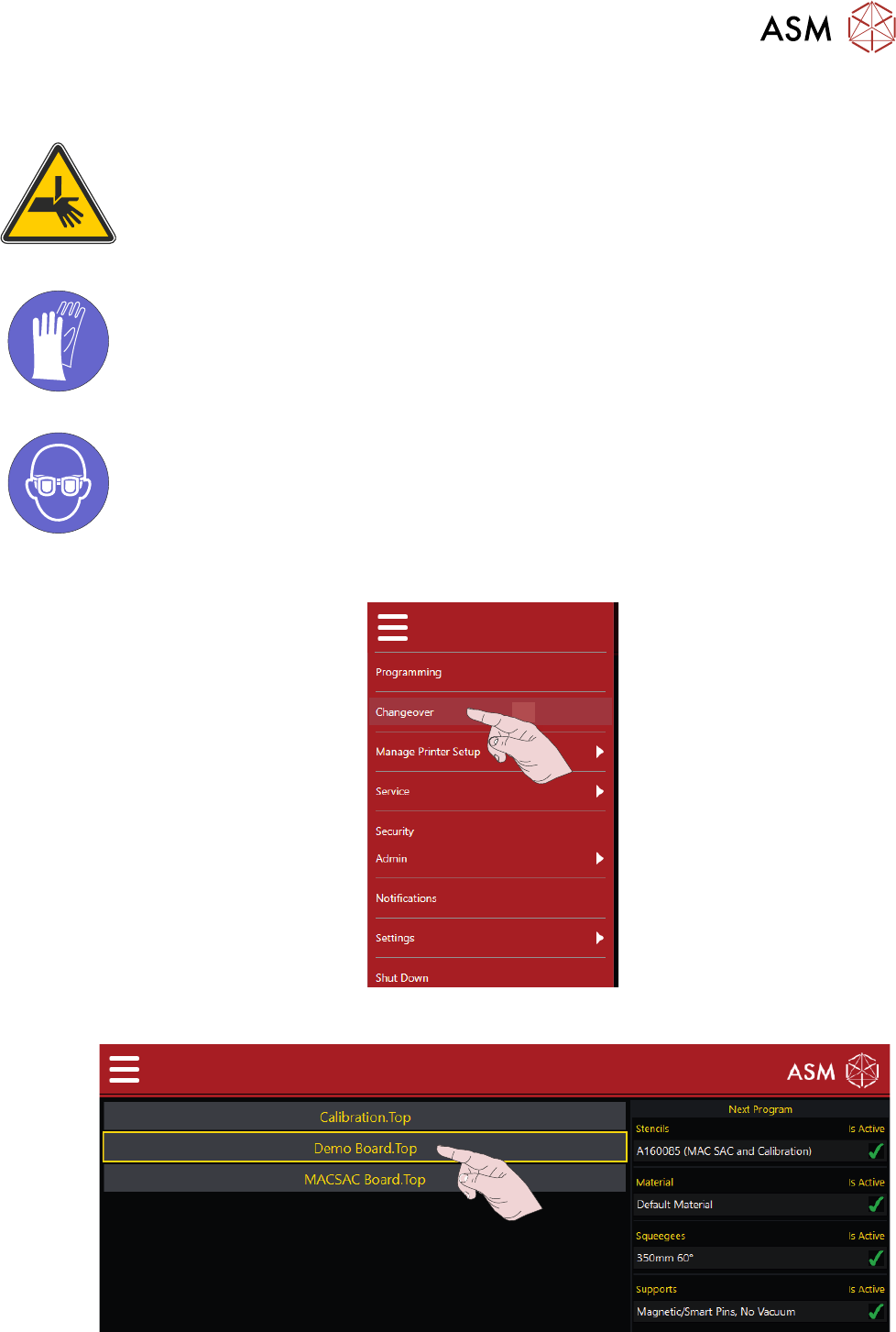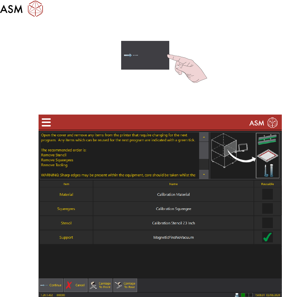 4 操作 4.2 产品转换 34 操作手册 DEK TQ 04/2021 3. Continue 4. 当前程序下带有绿色对勾的所有项目都可以在下一个程序中使用,并且在更换过程中不需要将 其从机器中移除;但可能需要将其卸下以进行维护或清洁。 5. 选择 Carriage To Front , 如有要求。