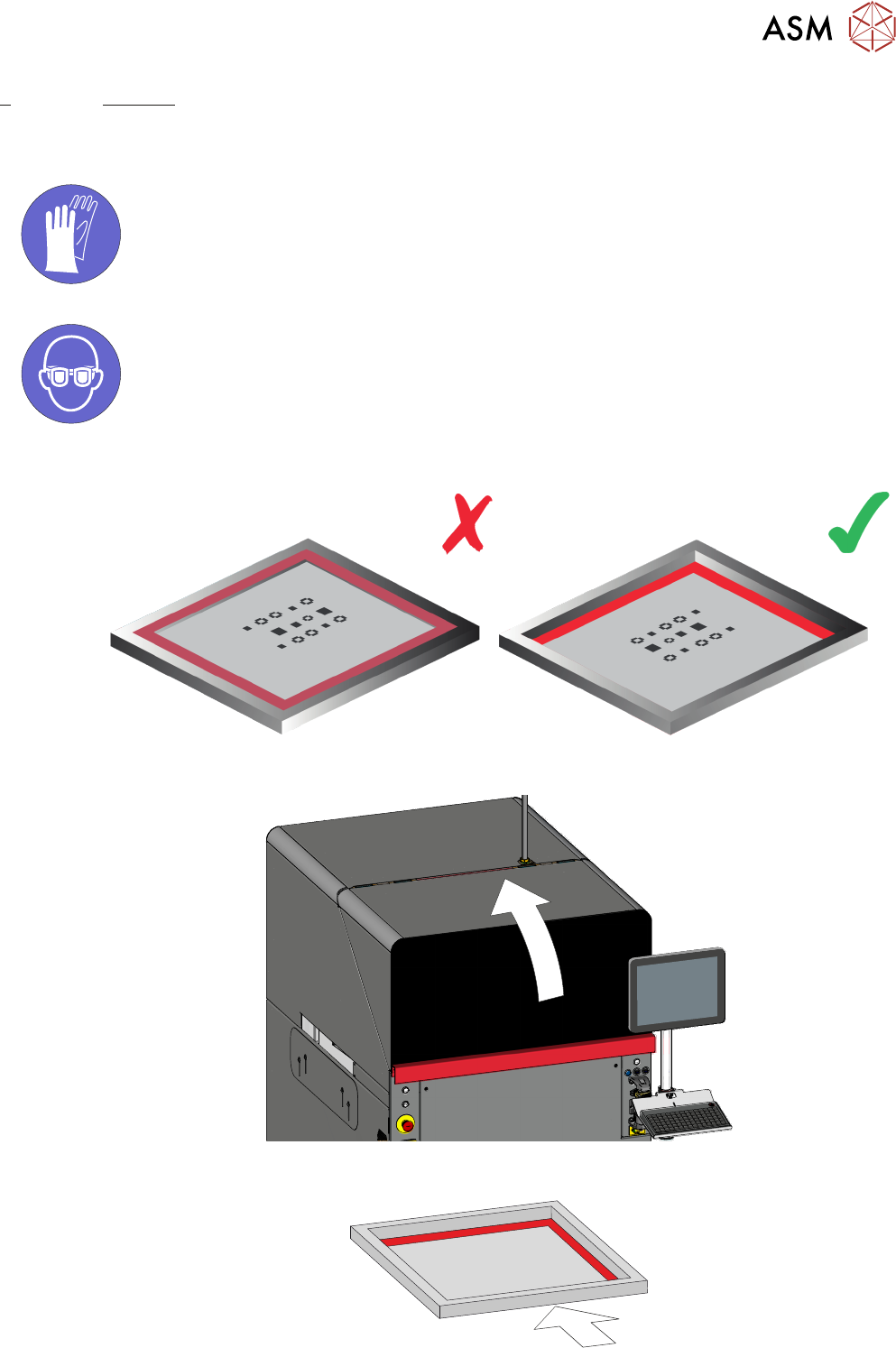 6 产品转换 6.1 装载丝网 操作手册 DEK TQ 04/2021 61 6 产品转换 6.1 装载丝网 强制性 有毒物质可能存在。 安全手套必须坚固。 强制性 。需戴防护眼镜。 有毒物质可能存在 1. 2. 3.