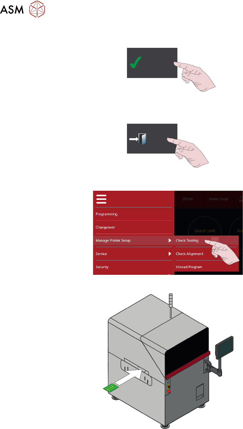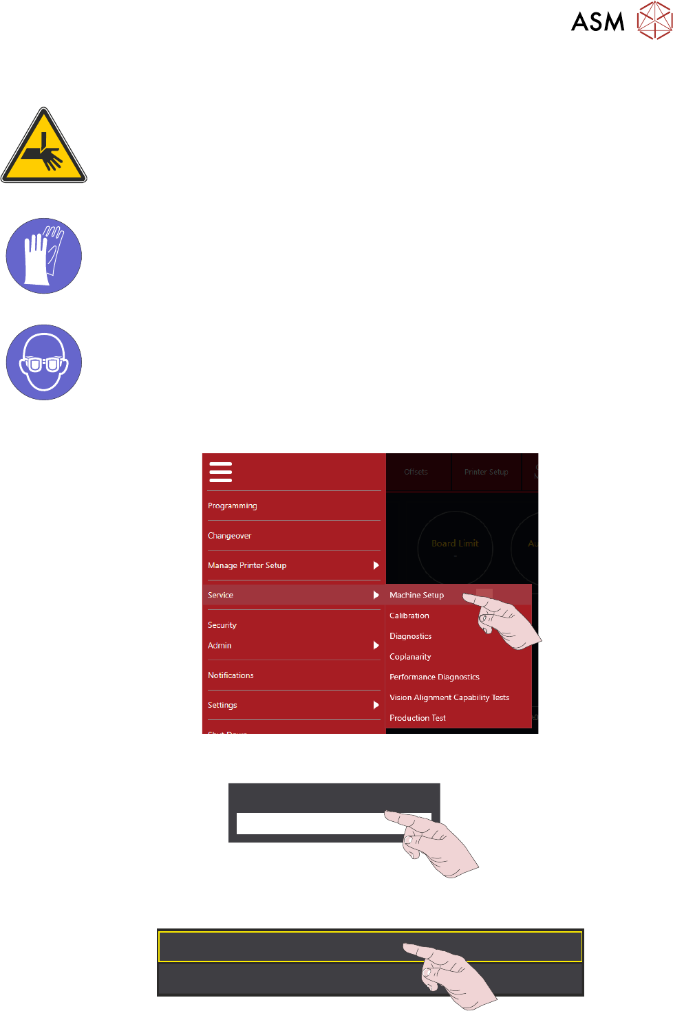 6 产品转换 6.2 设置工具 - 磁销 操作手册 DEK TQ 04/2021 63 6.2 设置工具 - 磁销 警告 夹板器。在机器工具区域工作时必须小心操作避免受伤。前后夹板 器的刀片非常锋利。 强制性 有毒物质可能存在。 安全手套必须坚固。 强制性 。需戴防护眼镜。 有毒物质可能存在 1. 2. Enabled V enturi V acuum T ooling 3. Disabled Enabled
