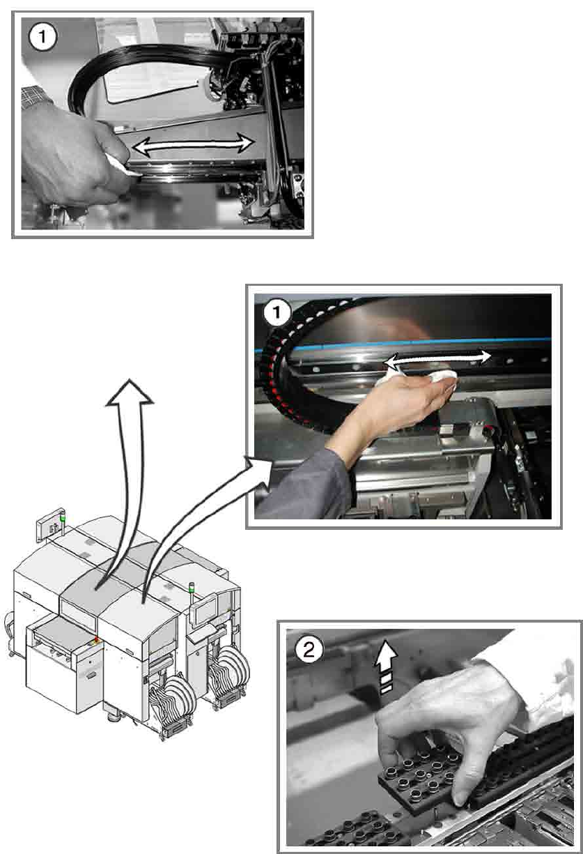 (1) 如果有需要,請用蘸有無水乙醇的無棉絮軟布清潔 X 和 Y 軸的增量光柵尺規。