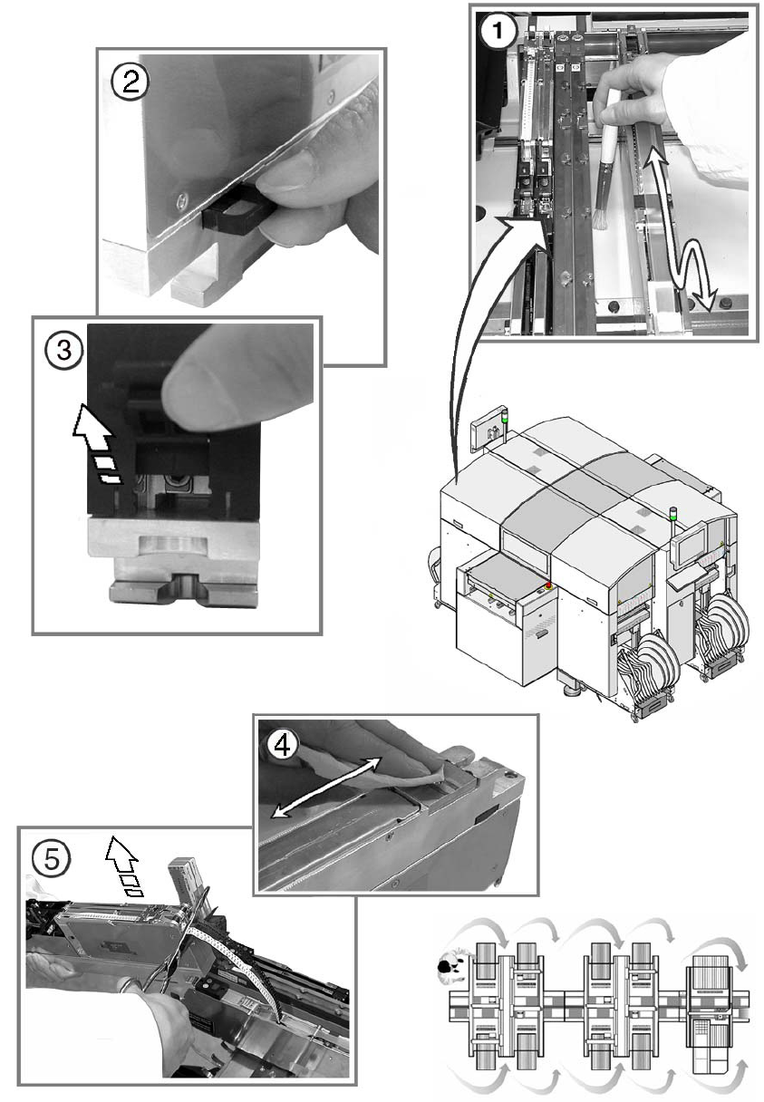 (4) 擦拭送料器模組的基座,並清除所有髒物。