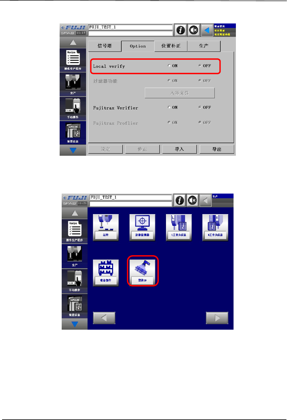 使本地验证功能生效后,选择[生产]时,显示出[登录 ID]。选择后,可以实行为了本地验证所必要的「验
