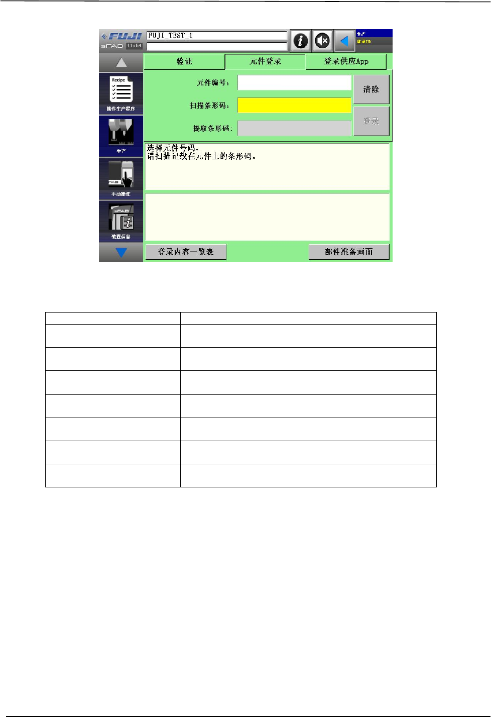 OPL V -sF AB-1.2S 2. 进行本地验证 SmartF AB 本地验证 快速参考手册 7 2. 进行本地验证 2.1 登录 ID 画面 2.1.1 验证画面 画面说明 名称 说明 应用软件条形码 通过手持扫描仪或者手工可以输入应用软件的条形码。 扫描条形码 通过手持扫描仪或者手工可以输入元件的条形码。 [ 清除 ] 清除输入的应用软件条形码、扫描条形码的值。 [ 登录内容一览表 ] 显示在机器上登录的验证信息一览表。 [ …