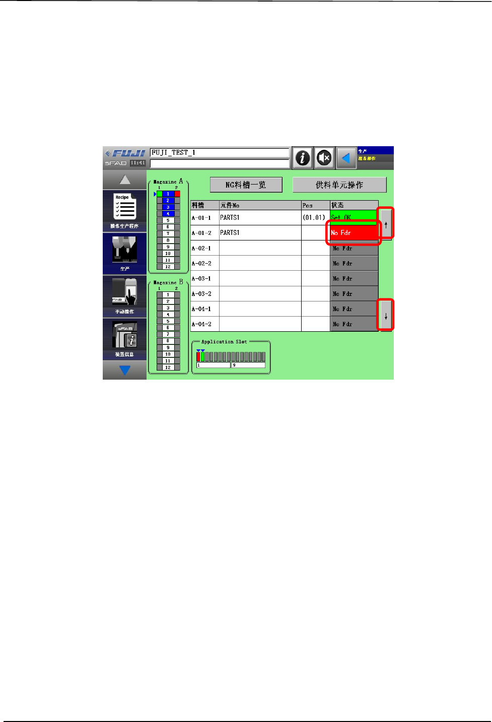 1. 在部件准备画面上、用[↑]/[↓]的操作显示供料器供应群组(Magazine A 或者 Magazine B)后确认状