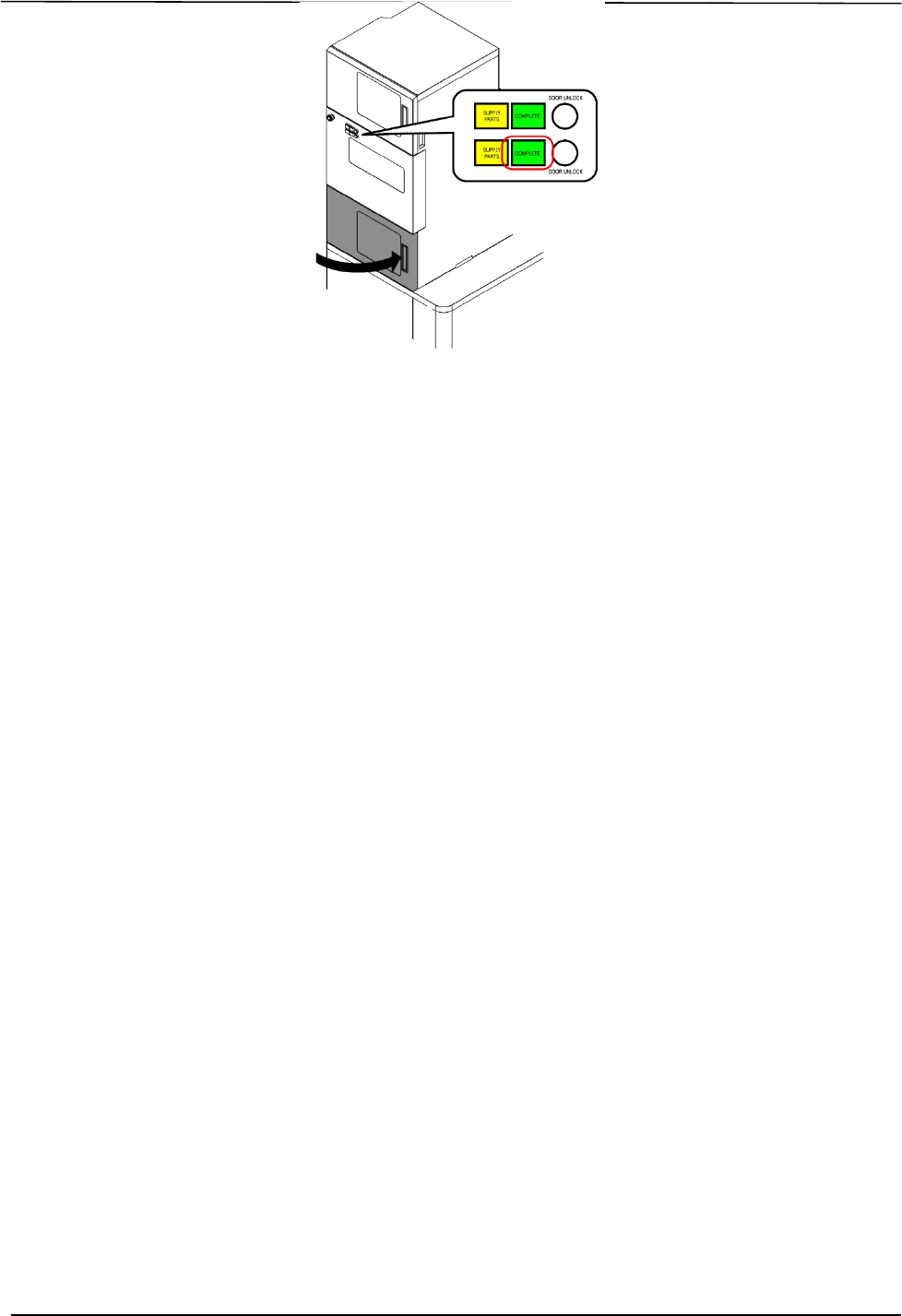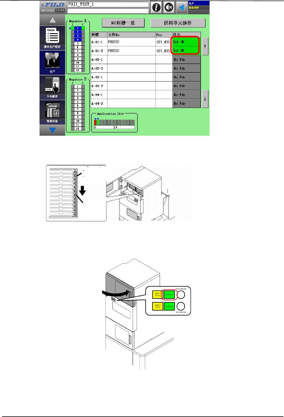 13. 料盘的更换(元件的补充)完成后请关闭正面门。COMPLETE 按键闪烁,请按下 COMPLETE 按键