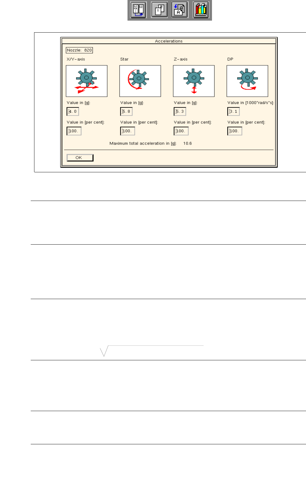 The acceleration value can either be entered in [g] for the x/y, star and z-axes, or in