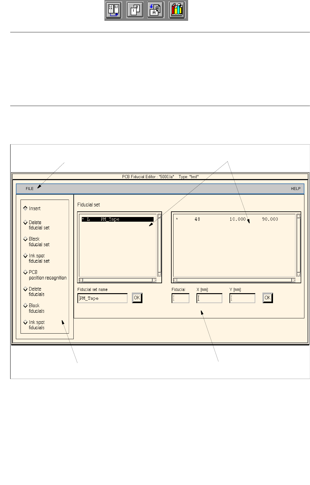This area contains the editing field for the names of a fiducial set, the number of a fiducial and the x/y coordinates