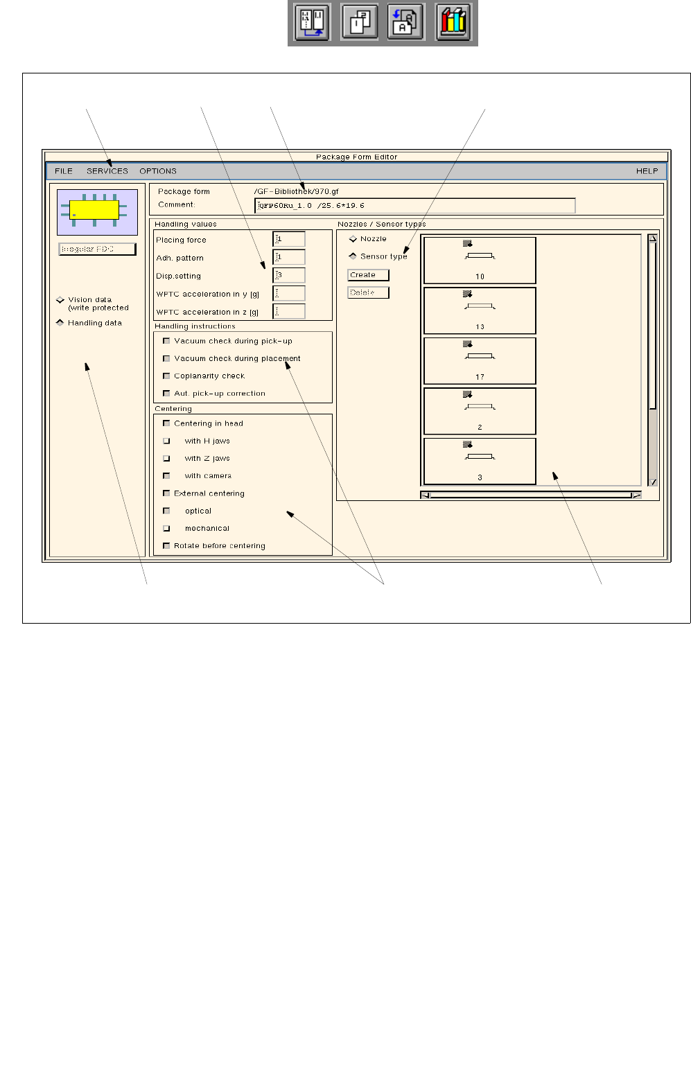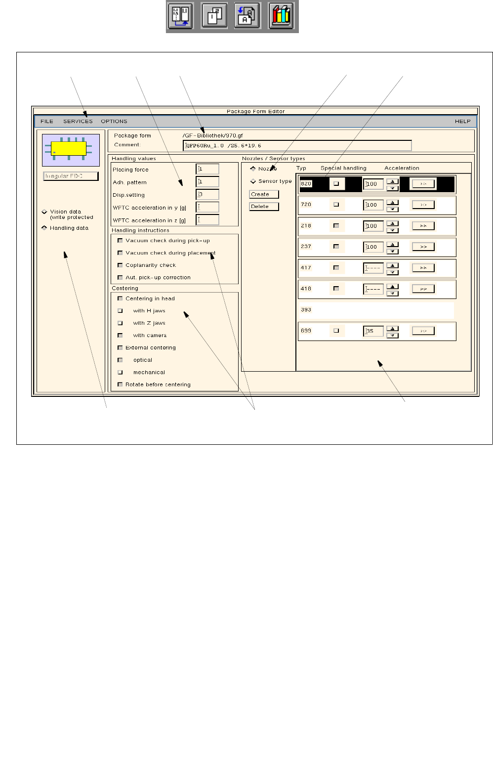 Fig. 6.1.4 Main Window "Package Form Editor (Displaying Handling Data - Irregular FDC)"