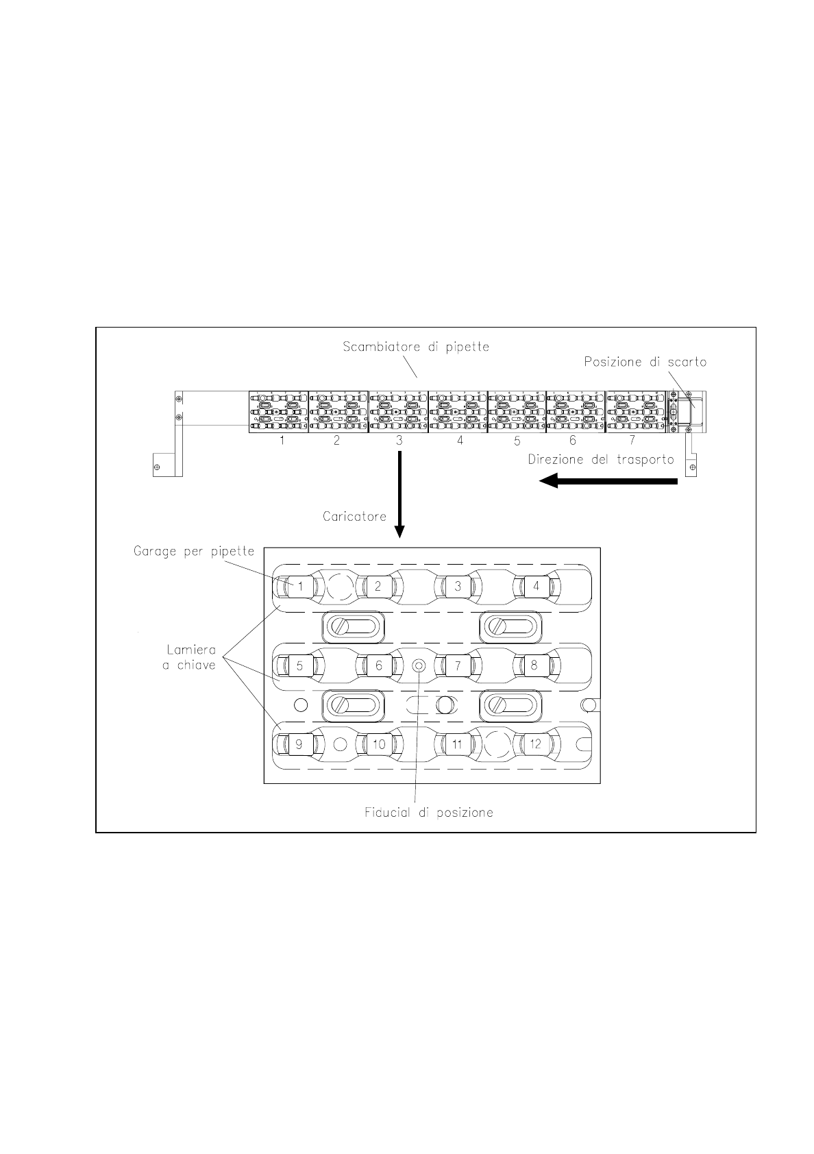 Fig. 11.1.2 Prospetto del caricatore e dei garage per pipette