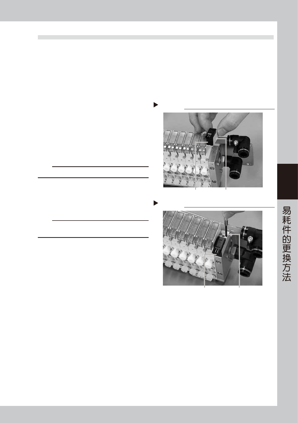 4-8 4 7 拆出电磁阀。 用精密十字螺丝刀拆下电磁阀的 2 颗固定螺丝之 后,拆出电磁阀。 55410-L1-00 c 注意 注意不要使嵌在电磁阀内的密封垫圈脱落。 8 安装新的电磁阀。 用精密十字螺丝刀拧紧新电磁阀的 2 颗固定螺丝, 固定新的电磁阀。 55411-L1-00 c 注意 请勿忘记装上密封垫圈,安装时注意密封垫圈的正反并不要 被夹住。 9 按与上述相反的步骤安装电磁阀单元。 将空气软管与插头插回原位。 0 接通供气与…