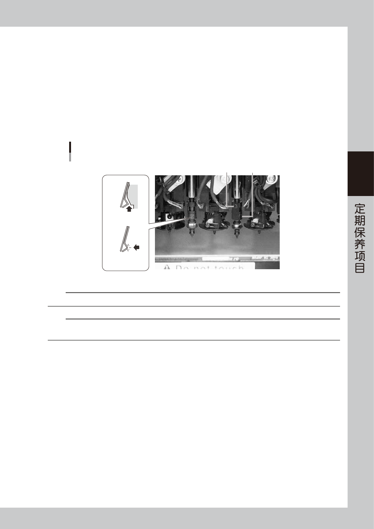 3-2 3 ■ 回弹部的清洁 1 e 拆下吸嘴。 1. 按紧急停机按钮之后,打开贴片机的正面机盖。 2. 从贴装头上拆下吸嘴。 配备吸嘴交换站时,按 [ 装置 ] -“Head”画面 的 [ 吸嘴交换站开闭器 ] 按钮,使吸嘴交换站 的开闭器打开之后,取出吸嘴。 2 清洁回弹部。 在回弹部涂上 IPA ( 异丙醇 ) 或乙醇之后,反复进 行回弹动作数次清洁回弹部。清洁完之后,用喷气 工具将 IPA 或乙醇完全吹干。 3 给回弹部加油。 …