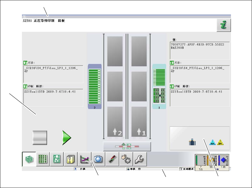 用户手册 SIPLACE SX1/SX2/DX1/DX2 5 使用贴片机 SC.705.xx 以上软件版本 2011 年 10 月 中文版 5.5 用户界面 245 5.5.1 状态区域 状态区域会显示当前的贴片机状 态、最近出现的错误和要执行的操 作。 状态区域右侧通过下面的图标来 显示状态: (绿色)启动当前视图的上下文联 机帮助功能。将对当前视图的所有 操作控制部件进行解释说明 (红色)启动帮助系统, 以显示导致当前错误发生的可能…