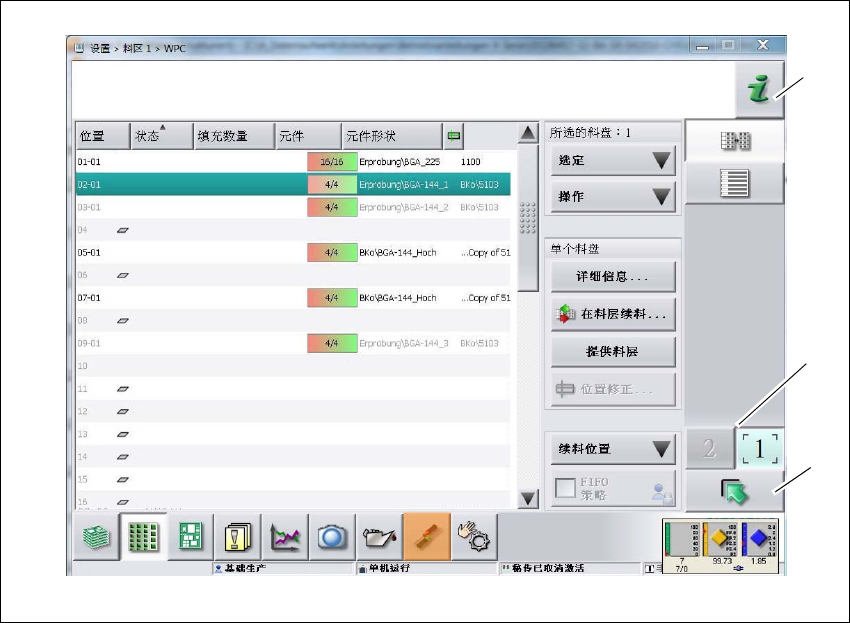 (2) " 上一级 " 按钮,返回上一个视图 (此处:" 供料器、元件和吸嘴 " 视图,见上图)