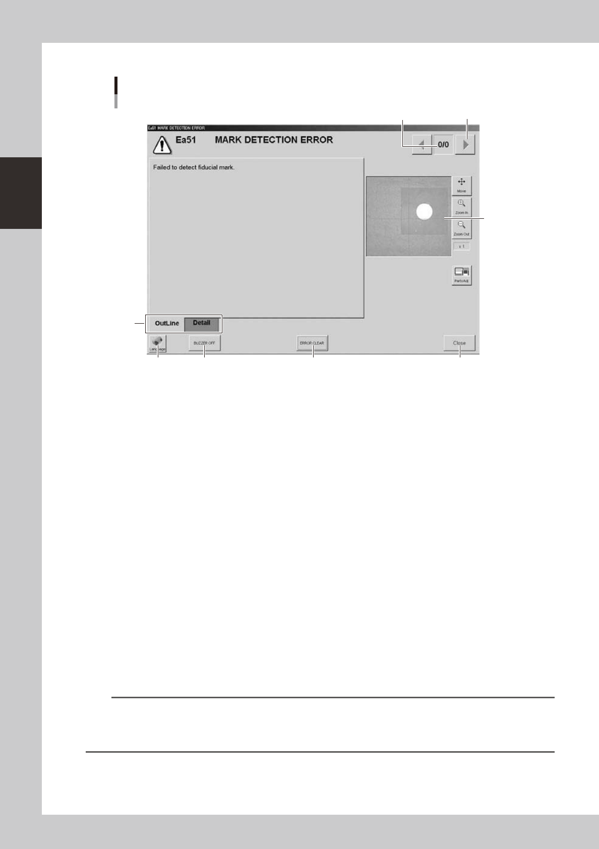 2-10 2  asic operation About error screen Error screen Mark detection error 1 2 3 7 4 6 5 [Error Switching] button 24202-H0-00 1. Error count display Shows the currently displa yed error and the total number of errors. …