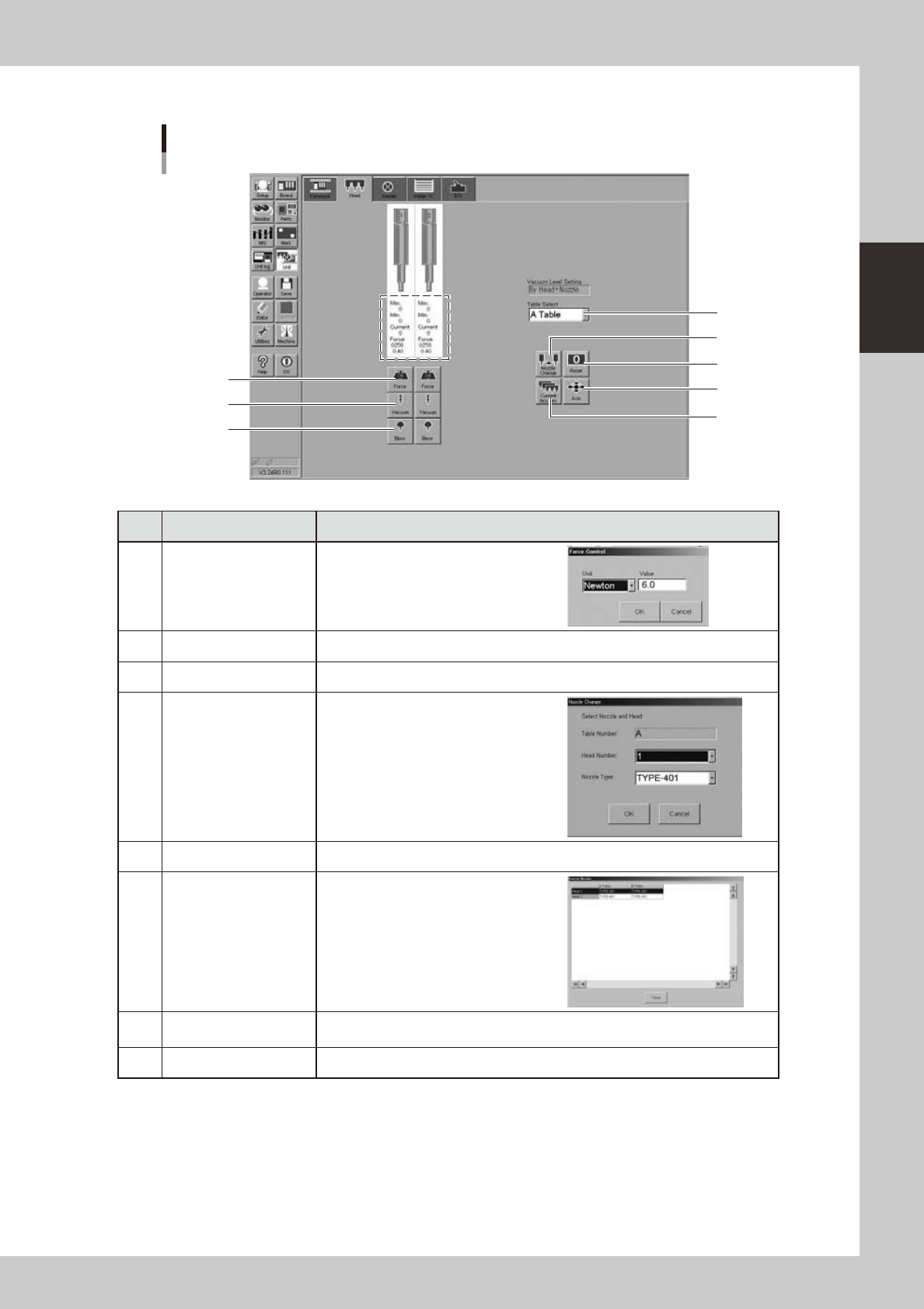 2-15 2 asic operation n Manual head operation [Unit] - [Head] screen Example of FF head 2 1 3 5 4 8 7 6 24207-H0-00 Button name Function 1 Force Use this button to set a load manually or check the set load. Units are e…