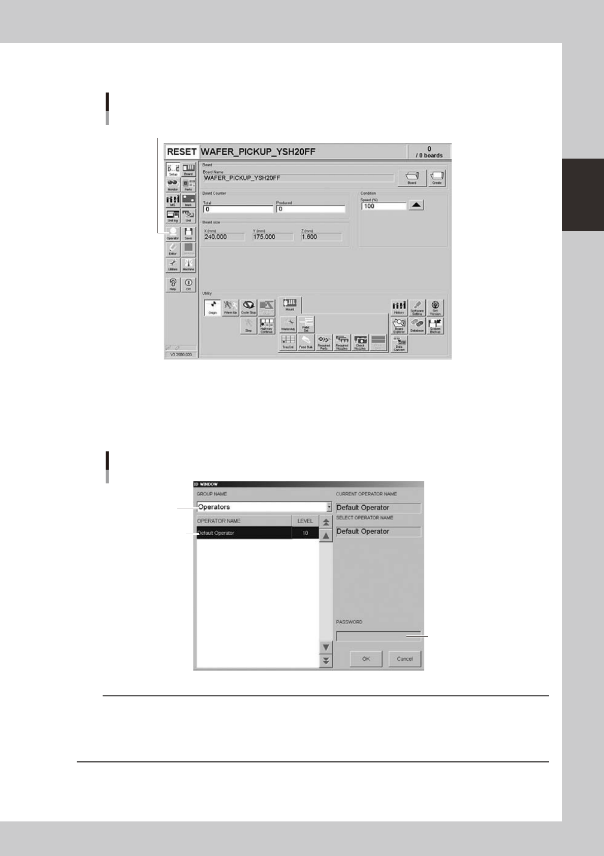2-21 2 asic operation 3 Pr ess the [Operator] button. The ID WINDOW dialog box appears for specifying t he operator . Press the [Operator] button to open the ID WINDOW . [Operator] button 24214-H0-00 4 Specify the oper…