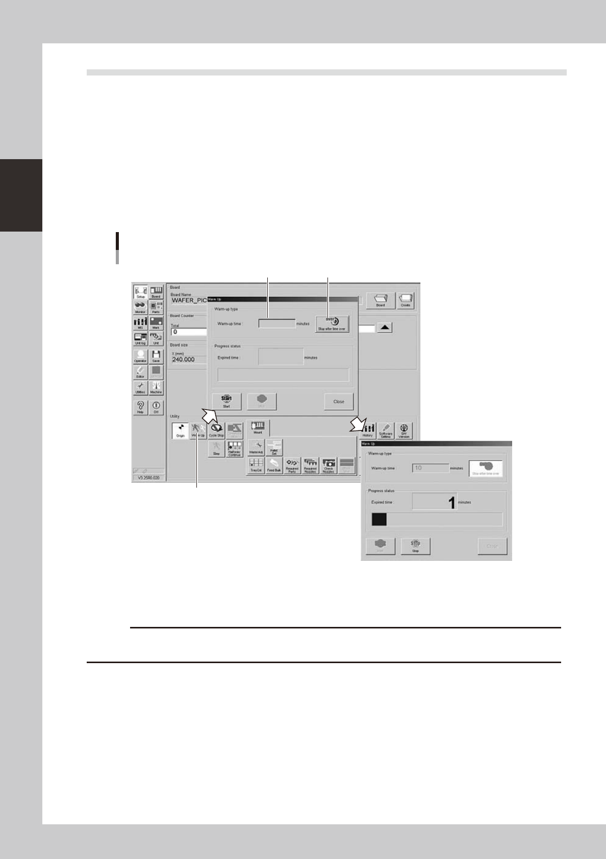 Press the [Stop after time over] button and enter the warm-up time. Warm-up will automatically stop