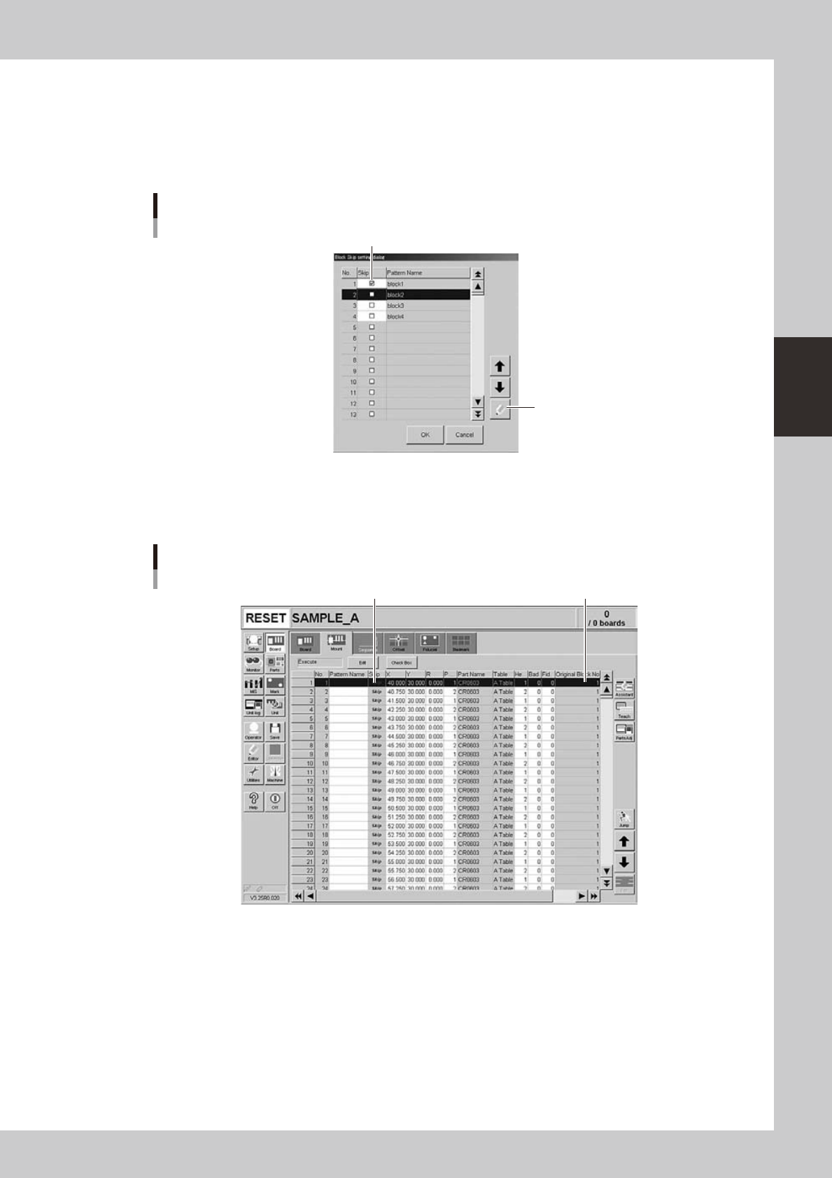 3-9 3 Starting and ending pr oduction 1.2.1 Selecting the blocks T o select the blocks where y ou want to skip mounting components, place a chec k mark in the chec k boxes for those blocks. (Directly clic k the chec k bo…