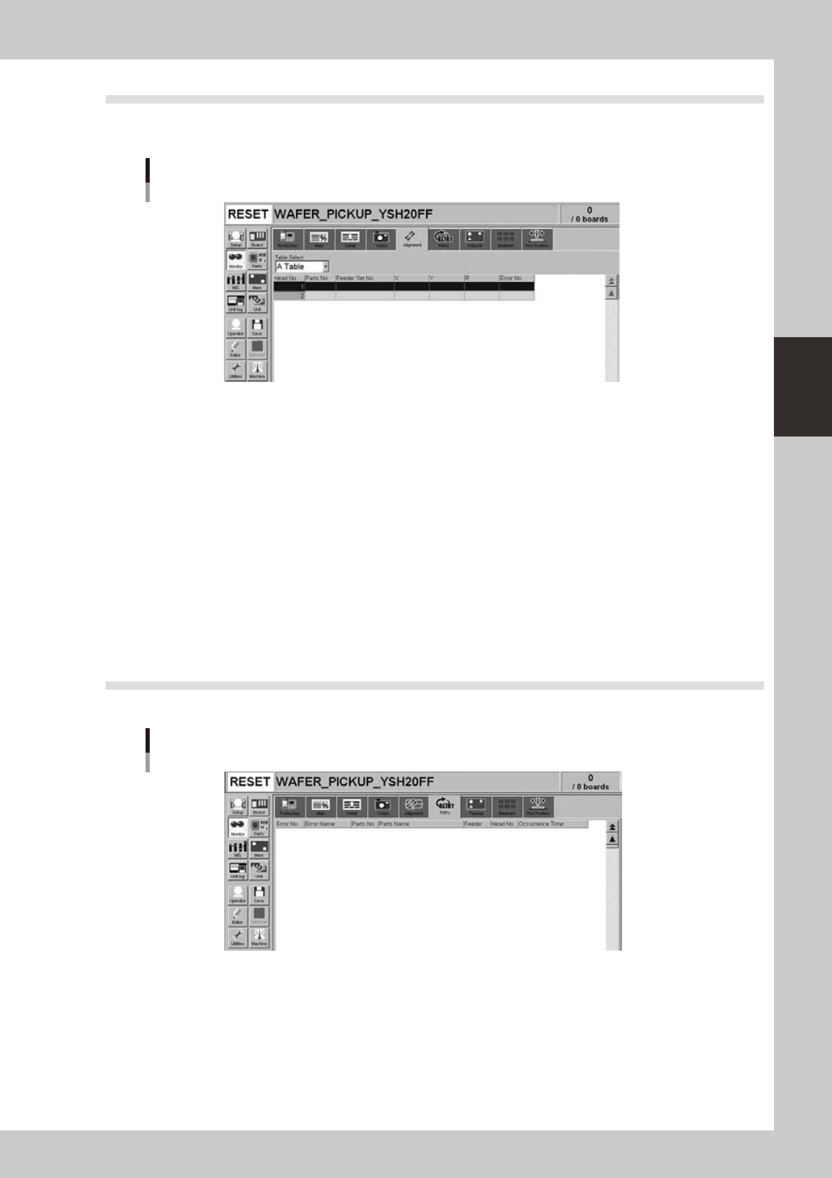 3-21 3 Starting and ending pr oduction 3.5 Alignment T he [Alignment] tab screen shows the offset amount of each head calculated from the recognition results obtained during automatic operation, as well as error numbers.…