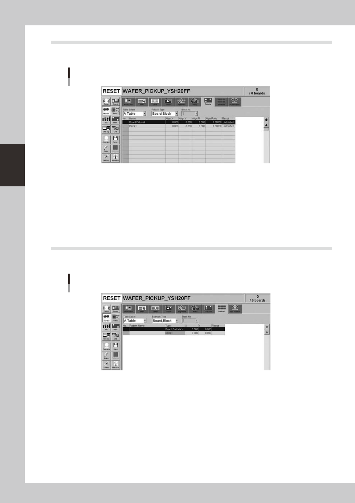 The [Fiducial] tab screen shows the recognition results of fiducial marks such as "Board, Block", "2 Point Local"