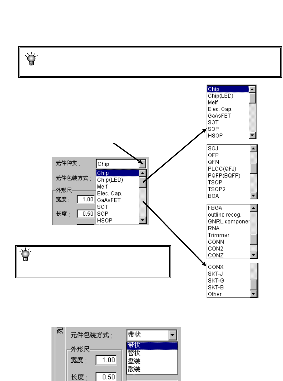 从显示的包装方式一览表中选择元件供给装置的种类。需要进行变更时,请从下拉式一览表