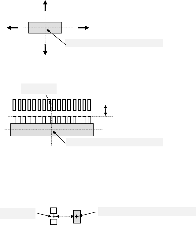 第4章 生产程序制作 Rev00 注 1) “贴片偏移” 值, 请输入从激光定心的中心位置到贴片坐标点的距离。 值的符号如下(箭头 为到贴片坐标点的距离) 激光定心的中心位置 贴片坐标点 激光定心的中心位置 激光定心的中心位置 贴片坐标点 例) 按下图贴片时,将贴片偏移输入为“X=0,Y=+3”。 3 -Y +Y -X +X 注 2) 偏移值以贴片角度“0” 为基准输入。 例) 元件的贴片角度为“90”时,假定 贴片角度为“0”,输入“…
