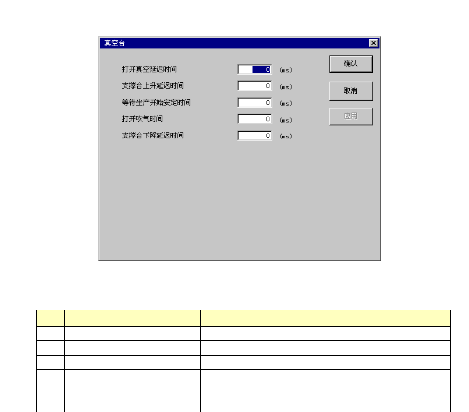 第 5 章 其它功能 Rev00 5-4-4-13 真空台 进行基板夹紧时的各真空设置。 若选择真空台,则显示如下图的真空台设置画面。 图 5 - 35 真空台设置画面 1) 设置项目 No. 项目 设置内容 1 真空 ON 的延迟时间 夹紧时从 STOP 传感器 ON 到真空 ON 开始的时间 2 支撑台上升的延迟时间 夹紧时,从真空 ON 开始到支撑台面上升开始的时间 3 生产开始稳定的等待时间 夹紧时,真空传感器 ON 探测时间 …