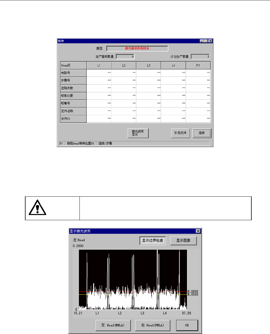 当暂停的原因为激光脏污错误、芯片直立错误、激光识别错误、异类元件错误时,显示激