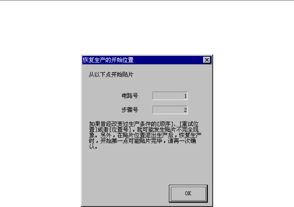 第2章 生产 Rev00 2-11-10 继续生产 当生产异常终止时(发生非同步情况, 生产异常终止), 可通过以下步骤继续进行生产。 但该 动作仅在至少有 1 个元件进行了吸取、贴片时进行。 2-11-10-1 生产异常终止 在异常终止的错误信息对话框中,按下“确认”按钮,显示如下画面。 图 2- 64开始继续生产的位置 在此按下“OK”按钮,则返回生产条件画面。 开始下一次生产时, 将确认是否从上述位置开始生产。 但如果已经通过程序…
