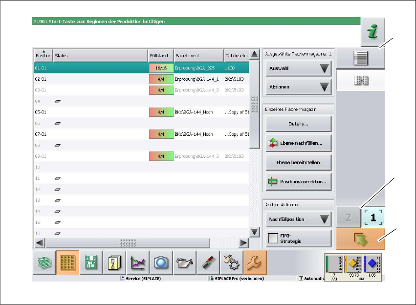Abb. 5.5 - 3 Bedienoberfläche in der Ansicht "Zuführmodul, Bauelemente und Pipetten" (am Beispiel der SIPLACE