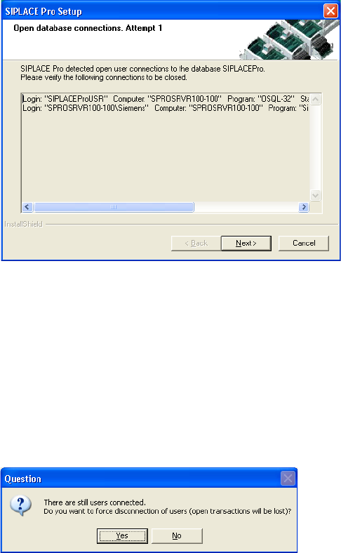 During upgrade, if users are connected to the database SIPLACEPro, a message similar to the