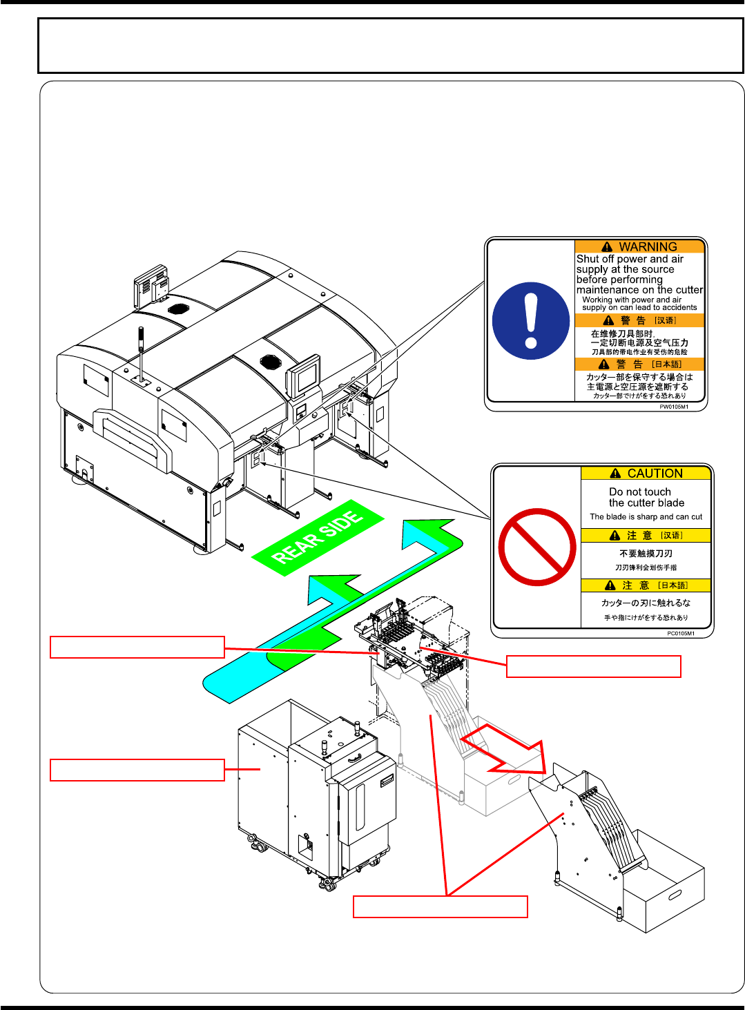 CM602-L 安装手册 15 关于 6 连供料器搭载部 ( 选购件 ) 的切割装置之使用方法 当连接直接托盘供料器时,直接托盘 供料器右邻必须同时连接 6 连供料器搭载部。在 6 连供料器搭载部连 接有用于切割编带的切割装置。通常 切割装置前面的元件卷盘支架装 置处于被固定的状态,不会接触到刀 刃,但是如果将其拆下时,从拆下处 将手伸入机器里面,则有直接触 摸到刀刃的可能性。为了安全起见, 请按照标签所指示,绝对不要将手伸 入到机器里…