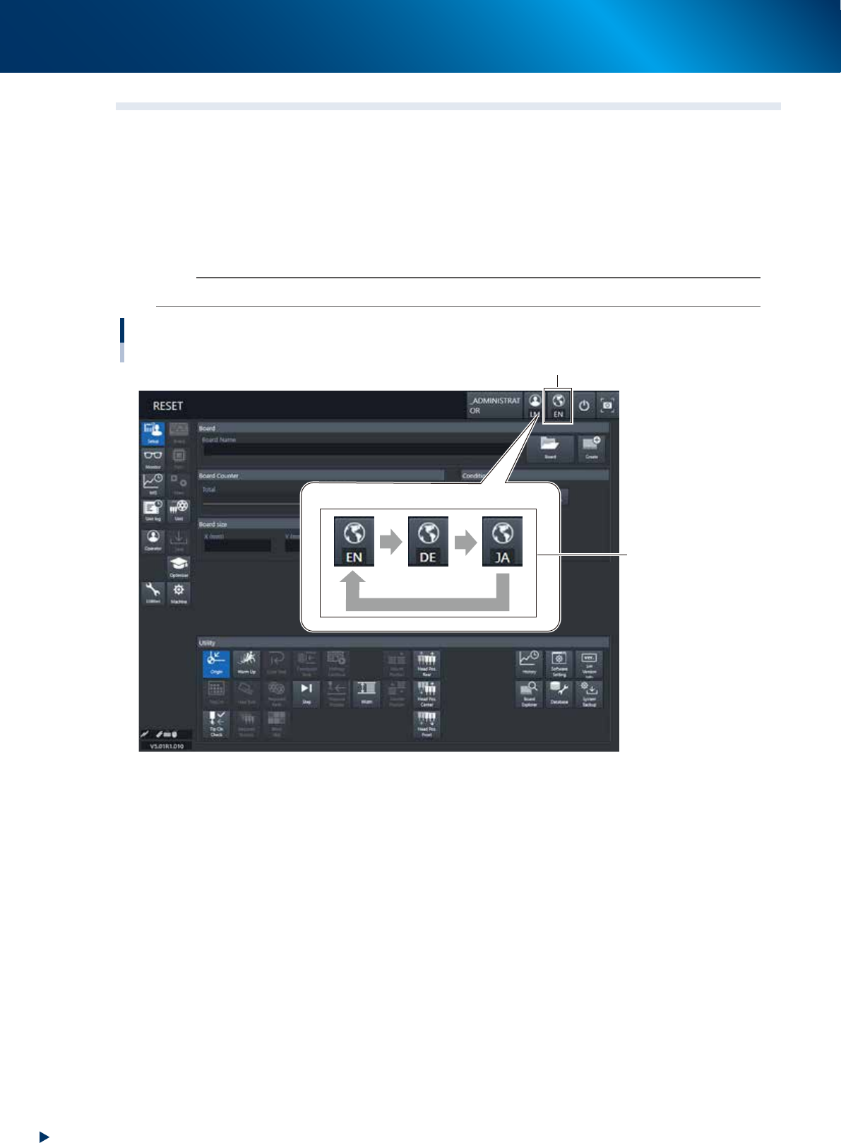 The "Language Switch" can be performed at any time regardless of operator level, machine status or displayed screen.
